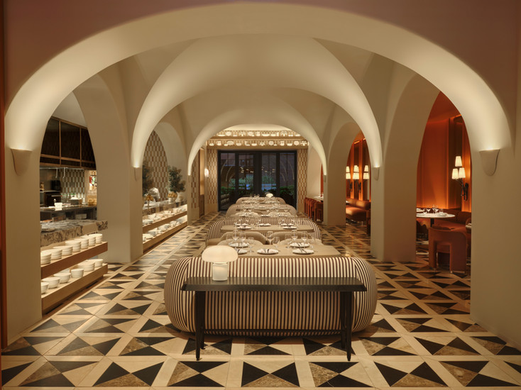 Daphne is a world unto itself, awaiting discovery. The entirety of the furniture and lighting is custom-designed, further establishing it as a space truly without parallel. The designer’s interiors often reference deeper inspiration from art, architecture, and cinema, and Daphne proves no exception. At the heart of the project is a cinematic duality of an immersive, Kubrick-inspired experimentation, contrasted with the softness and conviviality of the beloved aesthetic of a Nancy Meyers film. Unexpectedly playful and thoroughly redefining, the interior design takes on the timeless sophistication of the American bistro, inspiring guests to experience at once the joy of discovery and the effortless comfort of home.