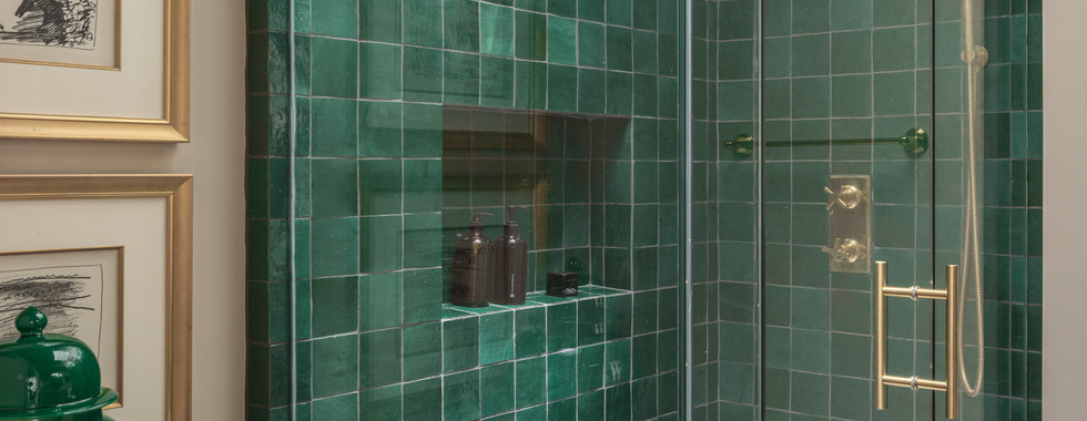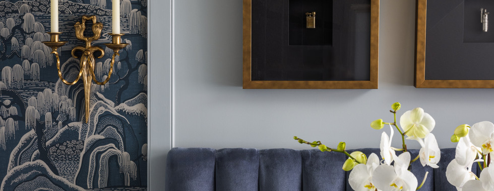 Functional furnishings were of the utmost importance to this client. A locally purchased, one-of-a-kind acrylic on stretched canvas sits above a luxurious camel-colored mohair sofa and greets guests who enter the living room. A Burlwood coffee table centers the lounge space, featuring a special piece created by the client's mother that hangs on the wall behind a steel blue velvet Ambella lounge chair. Additional notable pieces include the custom-built, channel-backed banquette built to be anchored against the wall, allowing more flow around the dining table. Schumacher wallpaper creates a border around molding that encases the banquette and hand-picked vintage brass lighters that are framed— a focal point that creates a timeless juxtaposition between old and new. Classic marble tile, quartz countertops, and a brass-clad hood furnish the existing kitchen space, and the all-white powder room was transformed into a moody oasis with Kelly Wearstler wallpaper. The primary bathroom received emerald-green hand-cut tile for the shower and a fun black and white penny tile for the floor. The floating wood vanity added a fresh modern moment, and a vintage cabinet was purchased and restored to house towels and other bathroom amenities to complete the space.